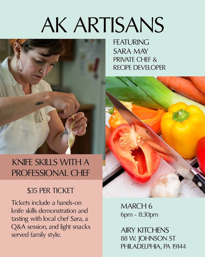 On March 6, join professional chef and recipe developer Sara May for a hands-on knife skills class designed to build confidence, efficiency, and enjoyment in the kitchen. With extensive experience in the Philadelphia restaurant scene, Sara brings a relaxed and encouraging approach to essential techniques you’ll use every day. Tickets include a hands-on demonstration, tastings of each dish we make together, and drinks and snacks served family-style. Learn proper grip, posture, and cutting methods while preparing Pico de Gallo, Chickpea Waldorf Salad, and Spicy Stir Fry. Sara will also share tips for working safely and efficiently, breaking down produce with ease, and making kitchen prep intuitive. This class is perfect for home cooks of all levels who want to sharpen their skills, feel more comfortable in the kitchen, and enjoy the process as much as the results. Bring your own chef’s knife to practice with your own tool, or use one of the limited knives provided. Sara May is a veteran of the Philadelphia restaurant scene, where she has worked in both savory and pastry kitchens. She began her culinary career as the pastry chef at the Franklin Fountain and was the opening pastry chef for Little Nonna’s and Aldine restaurants. She's worked in the kitchens of Vedge, Bing Bing Dim Sum, Hungry Pigeon and Bloomsday, and was the sous chef of Grateful Plate Meal Delivery & Catering. Sara was awarded the Rising Star Artisan Award from StarChefs for her work at The Franklin Fountain. Our Mount Airy showroom is located at 88 W Johnson St. Philadelphia, PA, 19144.