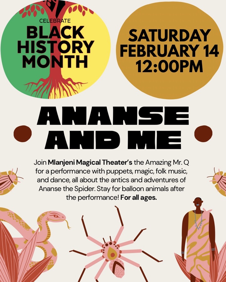 In celebration of Black History Month, join Mlanjeni Magical Theater for Ananse and Me! The Amazing Mr. Q. leads a performance with puppets, magic, folk music, and dance, all about the antics and adventures of Ananse the Spider. Stay after the performance for balloon animals! All ages are welcome to this fun event! Children under 7 years old must be accompanied by a caregiver. This event takes place on the library's 3rd floor, accessible by stairs or elevator.