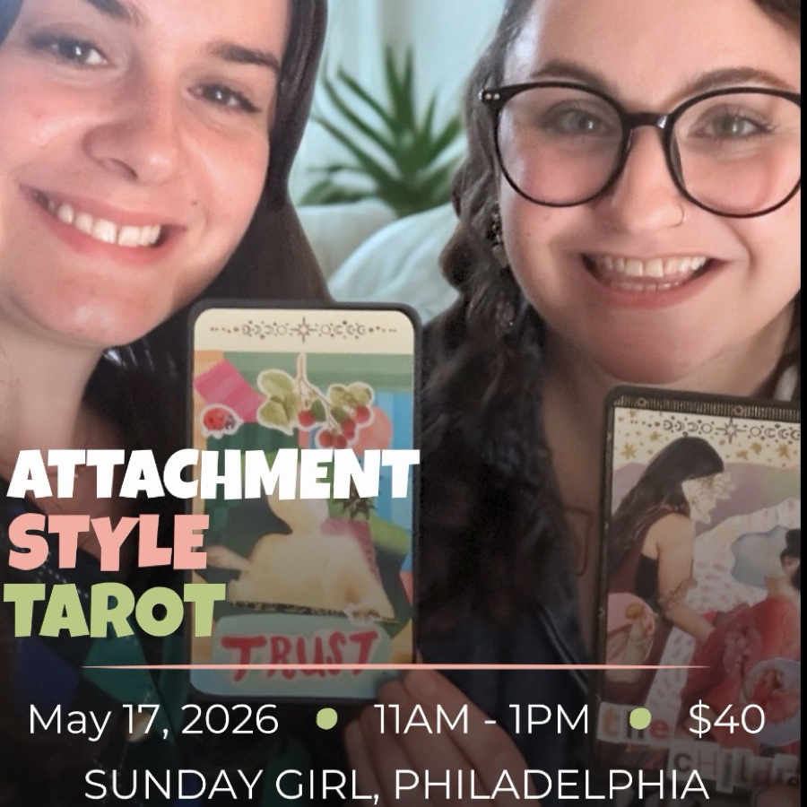 This workshop is for anyone who: Is curious about their attachment style Wants to make sense of their dating and relationship patterns Is ready to explore themselves in a deeper (but still lighthearted) way. We’ll be blending insight with intuition, using tarot as a playful, symbolic mirror alongside mindfulness, creative reflection, and meaningful connection with others. Think: part self-discovery, part soulful conversation, part fun, slightly mystical experience. No tarot experience necessary, but all participants will walk away with their own custom-crafted tarot card! Only 14 spots available! Location: Sunday Girl Philly 263 N 3rd St, Philadelphia, PA 19106 Date: May 17, 2026 Time: 11am-1pm Cost: $40 Includes your favorite coffee order on us!