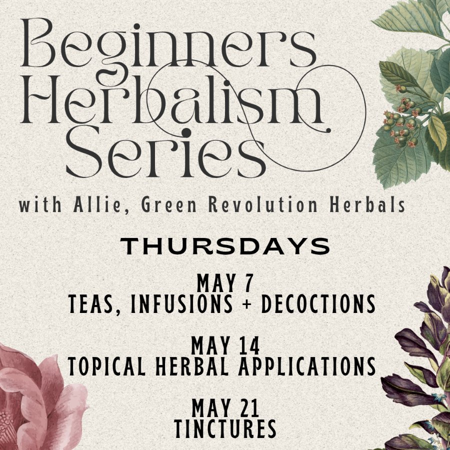 Learn the basics of herbalism from our resident herbalist and owner Allie, of Green Revolution Herbals. Allie will guide you as you learn about the medicinal qualities of plants, plant energetics, and recipes to make your own herbal medicines. We will spend time in the garden and make herbal concoctions together! Week 1: Water-based Extractions We will start class with an overview of herbalism and the mythology of plants. We will then discuss how to extract medicinal qualities of plants and other tips. We will end class by making individual tea blends to take home! Week 2: Topical Herbal Applications This week will be all about skin and inflammation! We will discuss how to make an oil infusion, salve, liniment, compress, and poultice. We will then make an oil infusion together for you to take home! Week 3: Tinctures Our third week will include a review of what we covered in the previous weeks and a discussion on whole-person wellness. We will then discuss alcohol-based extractions of herbs along with alternative methods. Students will make a tincture to take home with them! **Please NOTE, When signing up for this class, you are signing up for ALL THREE classes.