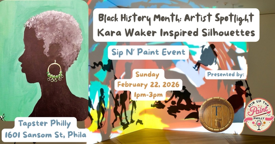 🖤 Black History Month Artist Spotlight: Kara Walker Join us for a special Sip & Paint experience honoring the work of groundbreaking African American artist Kara Walker. We’ll begin with a short discussion on Walker’s powerful use of silhouette imagery and how her work explores history, identity, and storytelling. Then, students will create their own silhouette-inspired paintings, drawing from her iconic visual language while painting their own truth. 🖤 No experience needed 🎨 All supplies provided 🍷 Drinks flowing 🎁FREE GIFTBAGS Paint loud. Paint free. Paint Black history—past and present. We’ll be hosted by Tapster Philly, a self-serve tasting room where you can sample a variety of beers, wines, ciders, and cocktails before pouring your favorites. It’s a unique and interactive way to sip while you paint! Learn more about Tapster here: https://www.tapstertastingroom.com/ ⚠️ PLEASE NOTE: • This event is 21+ • Class begins promptly—please arrive early for preferred seating • A 15-minute grace period is allowed; entry after that is at the Master Artist’s discretion • Refunds are only issued for cancellations made at least 24 hours before class time Questions? Contact us at StirUpThePaintPhl@gmail.com