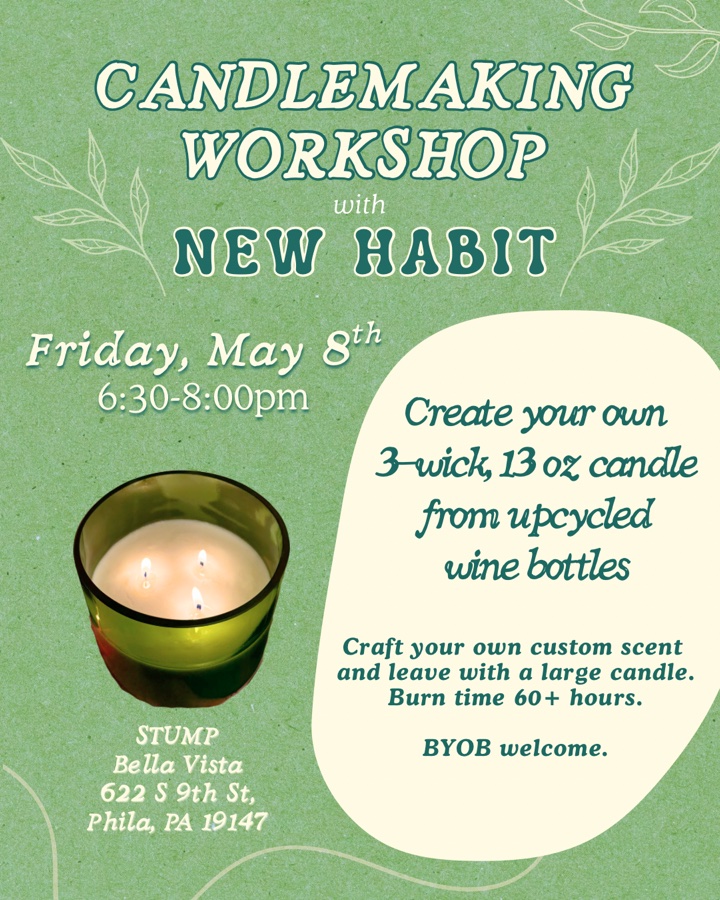 🕯️ Calling all candle lovers ~ Exciting new workshop announcement!! 🕯️ Join us on Friday, May 8th from 6:30-8 PM for a hands-on candlemaking workshop led by Jess, the artist behind New Habit, Philadelphia’s first candle brand dedicated to the circular economy. ♻️ ✨ In this 90-minute class, you’ll craft your own custom 3-wick, 13 oz candle poured into an upcycled wine bottle, blending your own signature scent to take home. New Habit candles are naturally made using coconut and soy wax, and Jess brings that same slow, intentional spirit to this workshop 〰️ an invitation to create something beautiful while keeping materials out of the waste stream. What to expect~ 🙌 Guided, hands-on instruction with group pour and personalized scent blending 👃🏼 Learn about fragrance notes and how to combine scents to create your own unique blend 🍷 Pour your candle into an upcycled wine bottle vessel 🕯️Leave with a large, 13 oz 3-wick candle with 60+ hours of burn time, made entirely by you! 🩷 Come solo, bring a friend or treat your mom just ahead of Mother’s Day! You’ll create a beautiful, handmade candle to take home or gift, and leave with the knowledge to keep making your own — long after the workshop ends. 🎟️ 9 tix available 👯♀️ $50/person 🍷 BYOB welcome 🌟 Tix available now!