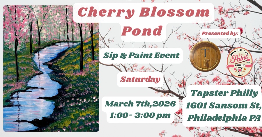 Join us for a fun-filled afternoon of creativity and self-expression at the “Cherry Blossom Pond” Stir Up the Paint- Paint and Sip Event! Get ready to unleash your inner artist as we guide you through the process of creating a stunning masterpiece, all while enjoying your favorite beverages. Whether you’re a seasoned painter or a total beginner, this event is open to everyone. Our talented instructors will provide step-by-step instructions, ensuring that you leave with a work of art you can be proud of. Our hosts at Tapster offer a Self-Serve Tapster bar, a newer concept in the Philly area where you can sample a variety of beverages, and then self-pour your favorites after sampling. You can find out more about Tapster at: https://www.tapstertastingroom.com/ NOTE: This event is 21+ CLASS BEGINS ON TIME, PLEASE ARRIVE EARLY FOR PREFERRED SEATING THERE IS A 15 MINUTE GRACE PERIOD, AFTER THE GRACE PERIOD ENDS IT IS UP TO THE MASTER ARTISTS’ DISCRETION TO ALLOW YOU TO JOIN REFUNDS ARE ONLY ISSUED TO CANCELATIONS MADE WITHIN 24 HOURS OF CLASS TIME. Reach out to Stirupthepaintphl@gmail.com for further questions
