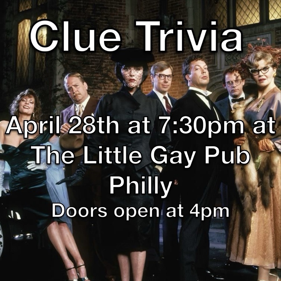 Join us on April 28th at 7:30pm at the Little Gay Pub Philly for Clue Trivia