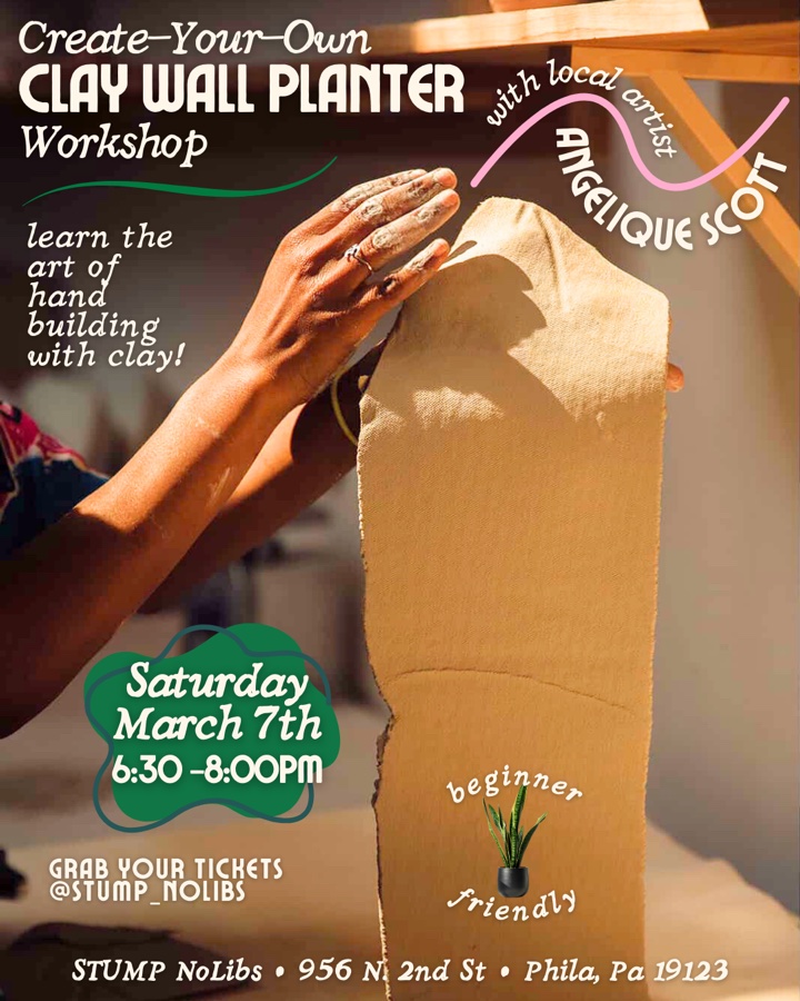Ever wanted to create with clay? Now’s your chance! Join us on Saturday, March 7th from 6:30–8pm at STUMP NoLibs for a beginner-friendly hand-building clay workshop with local artist Angelique Scott. You’ll learn how to design and sculpt your own custom wall planter with step-by-step guidance, all clay and tools provided! Come unwind, get a little creative, and enjoy a warm, welcoming space to slow down and connect — whether you bring a friend or come solo for a little self-care. :) Limited spots available!