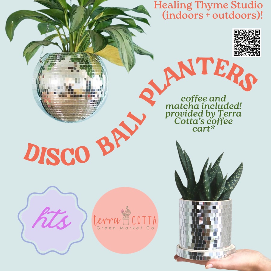Join us for a delightful indoor/outdoor event at Healing Thyme Studio and their charming courtyard! Participants will have the opportunity to create their very own disco ball planters, a fun and creative way to kick off the summer. Details: - Location: Healing Thyme Studio (see rain plan below) Included: - All materials to make your disco ball planter and 1 drink from Terra Cotta's coffee cart! Additional Drinks: Available for purchase with cash, card, or Venmo This is the perfect event to start your summer off on a creative note! Gather your friends, enjoy some refreshments, and unleash your artistic side while making a unique planter that will brighten up your space.