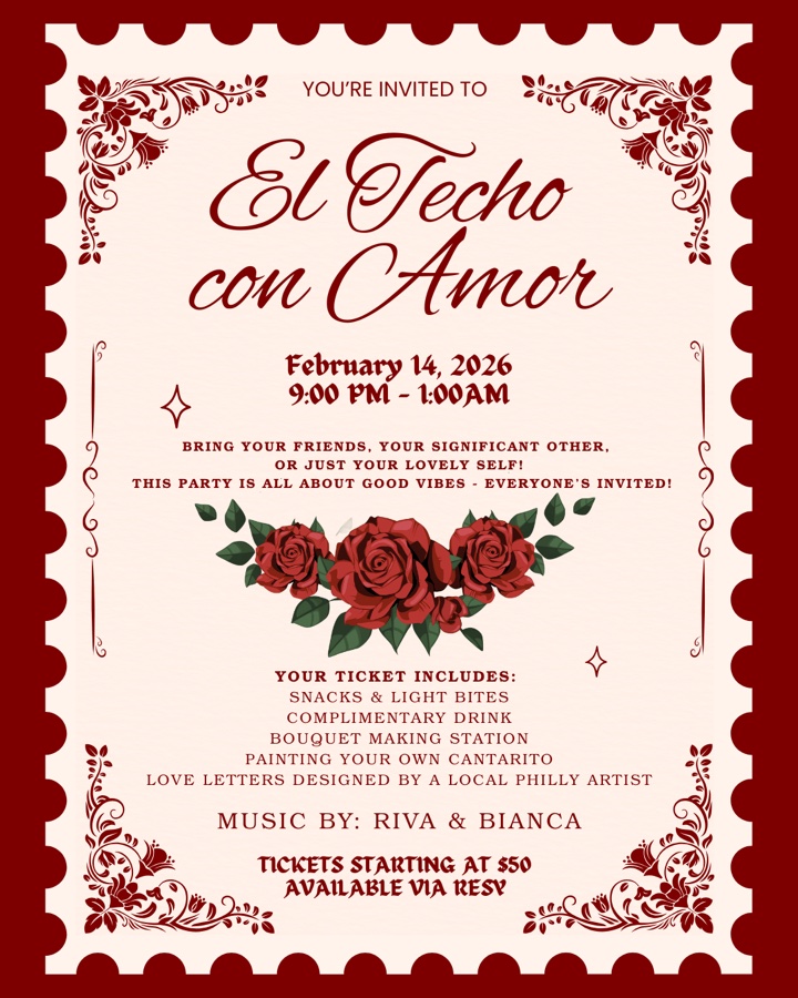 El Techo con Amor is our Valentine’s Day party for anyone who wants to celebrate love a little differently. Bring your Galentines, your Valentine, or come solo and make it a night just for you. Create your own bouquet, paint a cañarito, and write a love note on custom cards designed by a local Philly artist. Dance to sets by Riva & Bianca, enjoy a complimentary cocktail (including a few with aphrodisiac flair), and snack on light bites throughout the night. It’s a fun, feel-good way to celebrate love—however you define it—with the people you love most!