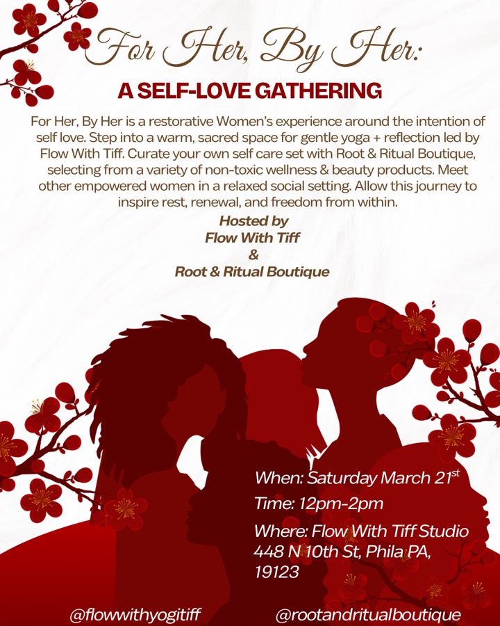 For Her, By Her is a restorative Women's experience around the intention of self love. Step into a warm, sacred space for gentle yoga + reflection led by Flow With Tiff. Curate your own self care set with Root & Ritual Boutique, selecting from a variety of non-toxic wellness & beauty products. Meet other empowered women in a relaxed social setting. Allow this journey to inspire rest, renewal, and freedom from within.