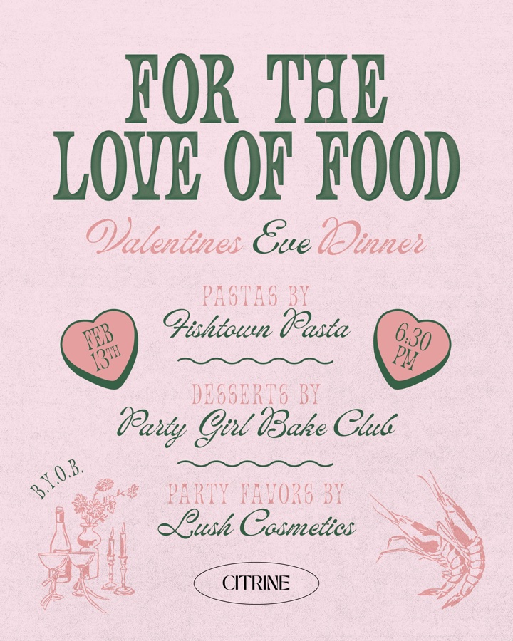 Welcome libations kick off this BYO four-course meal curated by the ever-talented Chef Amanda of Ives Table in collaboration with Philly legends Party Girl Bake Club and Fishtown Pasta. Leave with a full belly (and heart) plus a little self-care gift from Lush Cosmetics—just in time for Valentine’s Day. Celebrate Friday the 13th with a cozy BYOB four-course dinner that sidesteps the usual Valentine’s Day clichés. Enjoy a welcome drink and snack plus a seasonal menu by private chef Amanda of Ives Table, thoughtful desserts from Party Girl Bake Club, handmade bucatini from Fishtown Pasta, and pampering party favors from Lush Cosmetics—for people who care more about good food and good company than heart-shaped everything For this tasting event, you will be required to select your main course upon ticket purchase. A welcome drink and snacks will be provided upon arrival. This is a BYO event so please bring any wine/beverages you would like for the evening. Guests will leave with a goodie bag as our Valentine to you. Full menu is listed on our website. Can’t wait to spread the love!