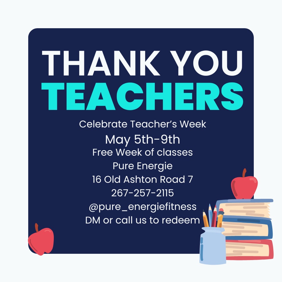 Teachers, this oneβs for you. You pour into everyone else all year. This week, let us pour into you. Pure Energie is offering teachers a FREE week of unlimited classes May 5thβ9th to celebrate Teacher Appreciation Week. Strength, cycling, circuits, all of it. Come move, breathe, and feel like yourself again in a women-only studio built for real women. Bring a friend who teaches. Tag a teacher who needs this. π 16 Old Ashton Road #7, Northeast Philly π 267-257-2115 π² @pure_energiefitness DM, text or call to redeem - view schedule on link