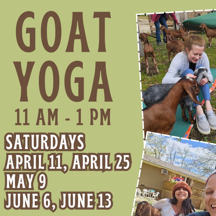 Join us for another year of Goat Yoga! Come stretch and hang with baby goats! This event is kid-friendly. Children 12 and under enter free. We have 5 dates for Goat Yoga: April 11, April 25 May 9 June 6, June 13 Our day will begin with a "meet and greet" of the goats at 11 AM. All-Levels Yoga will begin at 11:30 AM and will be an hour long class. End the day by hanging out with the goats some more! Or, bring a lunch and picnic with us! The baby goats you will meet and do yoga with are from Bramble Creek Nubians, raised by farmer Mackenzie. Farmer Mackenzie has been raising and showing Nubian dairy goats for nearly 10 years. She also manages a dairy cattle herd. She did 4-H growing up, and that's where she learned to share these animals with people that don't normally get to experience them! We are so grateful she is sharing her goats with us for this fun yoga experience. ** Bring with you ** Yoga Mat (we have a few extra on hand, too) Towel (to put under the mat in case the ground is wet) Change of clothes Water Lunch