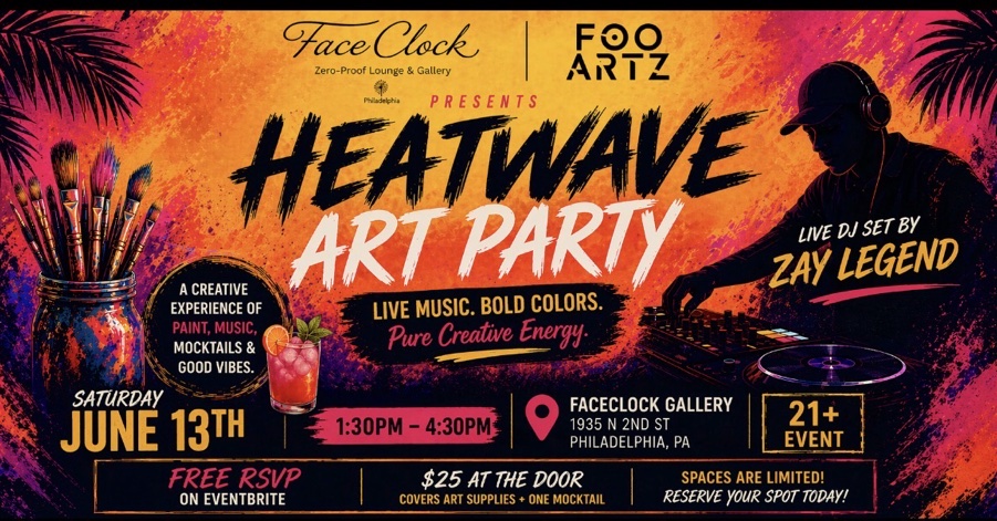🎨 Art Party w/ Live DJ Set by Zay Legend @ FaceClock Gallery An immersive afternoon of painting, music, and creative flow 🗓 Saturday, June 13 🕐 1:30 – 4:30 PM 📍 FaceClock Gallery | Philadelphia 🎟 Free RSVP | $25 at the door (includes art supplies + one mocktail) 🧑🎨 Ages 21+ | Limited seating ⸻ ✨ Where art meets sound We’re bringing something new to Art Party — live music. Join us for a special edition of our Art Party featuring a live DJ set by Zay Legend — known for his work with Art Battle Philadelphia & Wilmington. His sound will guide the energy of the room, helping you drop into flow, movement, and creative expression. This is more than a paint session — it’s a full sensory experience. ⸻ 🎧 Meet the Artist Behind the Sound DJ Zay Legend is a staple in the local creative scene, bringing dynamic, high-energy sets to Art Battle events across Philly and Wilmington. His ability to read the room and build atmosphere makes him the perfect addition to this evolving Art Party experience. ⸻ 🖌️ What to Expect ✔️ Guided abstract painting session ✔️ Live DJ set throughout the event ✔️ All materials provided (canvas, paints, brushes, aprons) ✔️ Creative warm-up + intuitive prompts ✔️ One mocktail included with entry ✔️ A welcoming, judgment-free creative space Paint freely, move with the music, and let your creativity unfold naturally. ⸻ 🪑 Limited Seating To keep the experience intimate and immersive, space is limited. Doors open at 1:15 PM — we’ll begin at 1:30 PM sharp. ⸻ 💜 Entry Details RSVP is free, with $25 collected at the door, which covers: • All art supplies • One handcrafted mocktail • Access to the full experience ⸻ 📋 Good to Know • 21+ event • Alcohol-free space • No outside beverages, please • Wear something you don’t mind getting paint on • All experience levels welcome ⸻ 🎟️ Reserve your spot now and experience Art Party in a whole new way — where music, movement, and creativity come together.