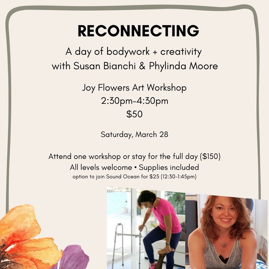 A restorative opportunity to reconnect with your body, your creativity, and the powerful wisdom and supportive energy exchanged when we work on and with each other. Joy Flowers Art Workshop | 2:30pm–4:30pm The afternoon features Joy Flowers, a creative art workshop focused on expression, presence, and well-being. No prior art experience needed. All supplies are included. Also happening: Learn Ki-Hara Mashing | 10:00am–12:00pm The morning begins with Ki-Hara Mashing where you will learn and apply the bodywork technique called Mashing, a technique done with our feet to release and restore muscles, fascia, and overall health. You may register for one workshop or stay for the full day.