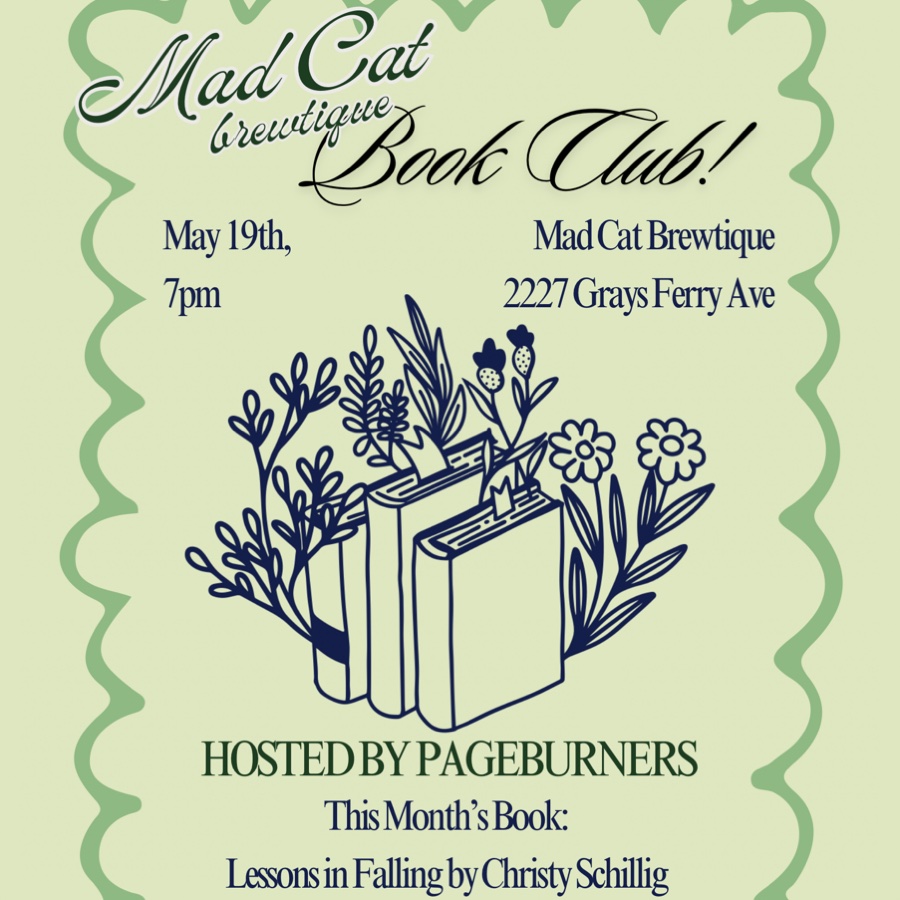Join us for May’s book club! This month we are spotlighting a local author with a romance set in Philly. This book club is hosted by Pageburners at Mad Cat Brewtique. Purchase the book of the month from Pageburners and get a discount, then during book club enjoy $1 off all drinks and goodies! We will have an assortment of sweet treats and savory snacks. Can’t wait to see you in!