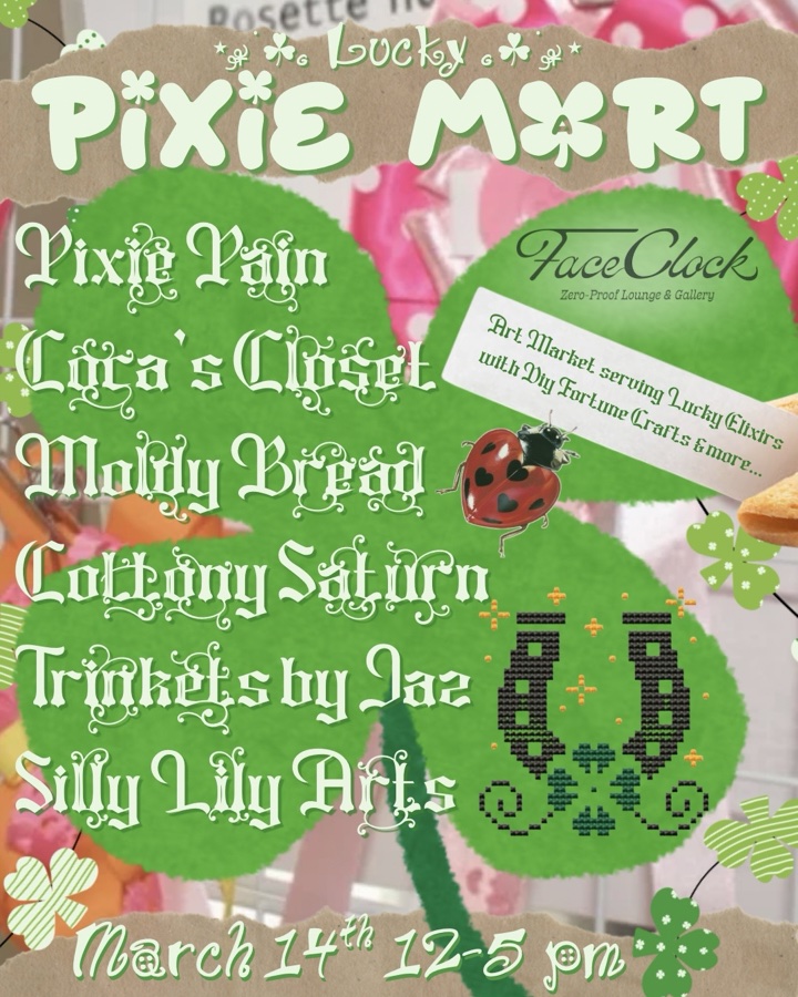 we have the fortune of inviting you to shop & craft at our free lucky art market at @faceclockgallery on March 14th from 12-5 PM. 🍀𝓁𝓊𝒸𝓀𝓎🍀 •ᴗ• .☘︎ ݁˖ DIY fortune craft: make your own pixie themed fortune teller! .☘︎ ݁˖ we ask that you keep alcohol & all beverages out of the establishment in respect for our in-house mocktail bar by Face Clock.