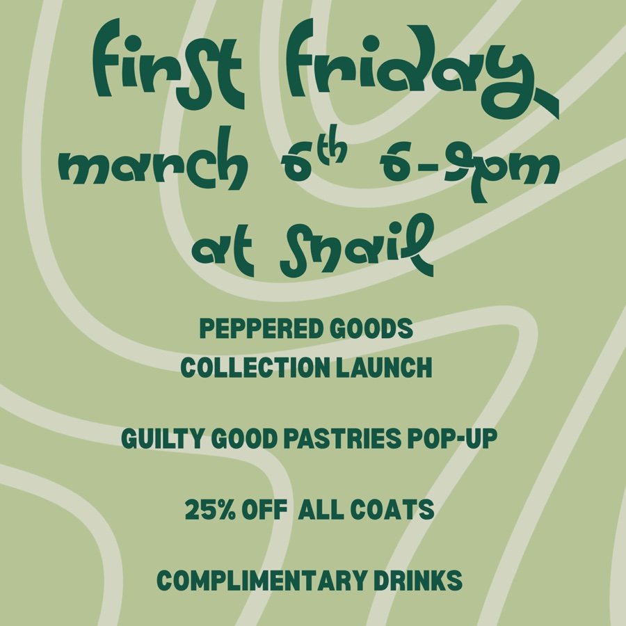 We are kicking off the month of March with a First Friday party you won’t want to miss! We will be hosting Guilty Good Pastries, a local baker who focuses on Korean-inspired baked goods. We will also be welcoming Peppered Goods to the shop for the month of March with a curated collection of great transitional vintage pieces, including some lightweight pieces to get you ready for Spring! To get you through the last few weeks of winter, all of our vintage coats will be 25% off! Stop by and enjoy a complimentary beverage while you shop!
