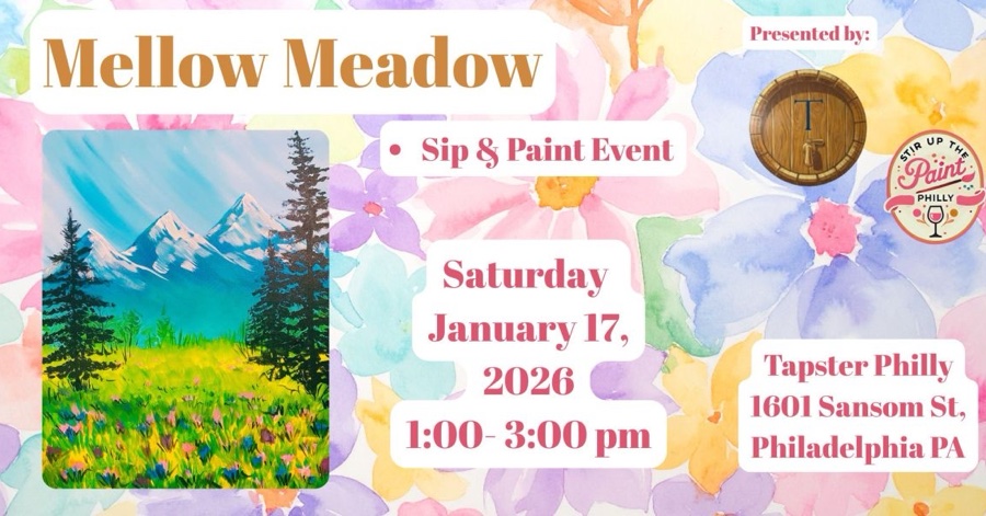 Join us for a fun-filled afternoon of creativity and self-expression at the “Mellow Meadow” Stir Up the Paint- Paint and Sip Event! Get ready to unleash your inner artist as we guide you through the process of creating a stunning masterpiece, all while enjoying your favorite beverages. Whether you’re a seasoned painter or a total beginner, this event is open to everyone. Our talented instructors will provide step-by-step instructions, ensuring that you leave with a work of art you can be proud of. Our hosts at Tapster offer a Self-Serve Tapster bar, a newer concept in the Philly area where you can sample a variety of beverages, and then self-pour your favorites after sampling. You can find out more about Tapster at: https://www.tapstertastingroom.com/ NOTE: This event is 21+ CLASS BEGINS ON TIME, PLEASE ARRIVE EARLY FOR PREFERRED SEATING THERE IS A 15 MINUTE GRACE PERIOD, AFTER THE GRACE PERIOD ENDS IT IS UP TO THE MASTER ARTISTS’ DISCRETION TO ALLOW YOU TO JOIN REFUNDS ARE ONLY ISSUED TO CANCELATIONS MADE WITHIN 24 HOURS OF CLASS TIME.