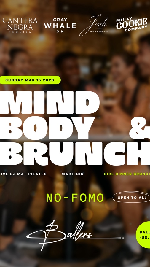March 15th 🚨 MIND BODY & GIRL DINNER BRUNCH presented by Meet Philadelphia and The Girls Room at Ballers Philadelphia in partnership with Deutsch Family Spirits on National Espresso Martini Day Schedule Sunday March 15 2026 11:00-2:00 EST Live DJ Mat Pilates 11:00-11:45 AM EST Girl Dinner Brunch 12:00-2:00 PM EST $50 All—Inclusive Experience includes Live DJ Mat Pilates and Girl Dinner Brunch Brands • Vendors • Giveaways Complimentary Tote Bag with Goodies Note *Food and Beverage not included for Brands Girl Dinner Brunch Menu Caesar Salad and Waffle Fries Choice of Wine • Martini • Signature Cocktail Ballers Philadelphia 1325 North Beach Street Philadelphia Pennsylvania 19125 http://posh.vip/e/meet-philadelphia-presents-mind-body-girl-dinner-brunch