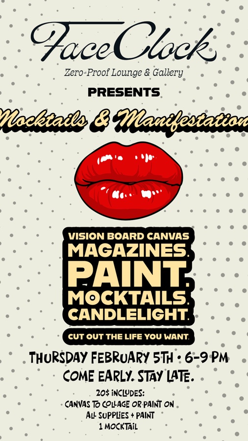 Canvas. Magazines. Paint. Mocktails. Candlelight. Cut out the life you want. Come alone. Come with a date. Come after a breakup. Come fall in love with your future. Thursday February 5th • 6-9 PM Come early. Stay late. $20 includes a mocktail + canvas + all supplies.