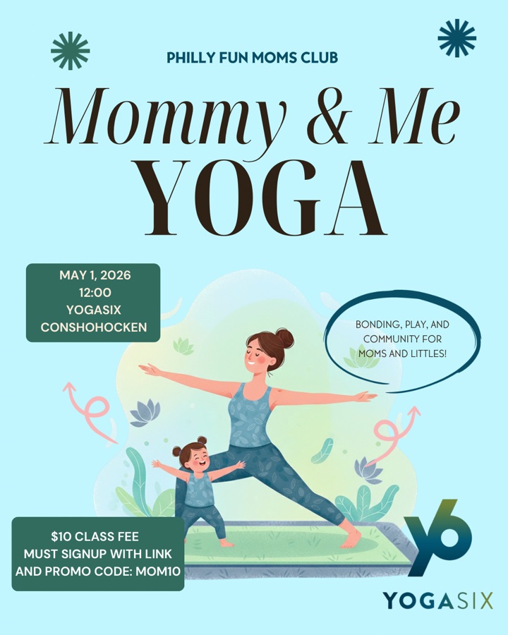 Join us for mommy and me yoga at YogaSix Conshohocken! Must sign up with link and promo code MOM10! 💜🩵💜🩵