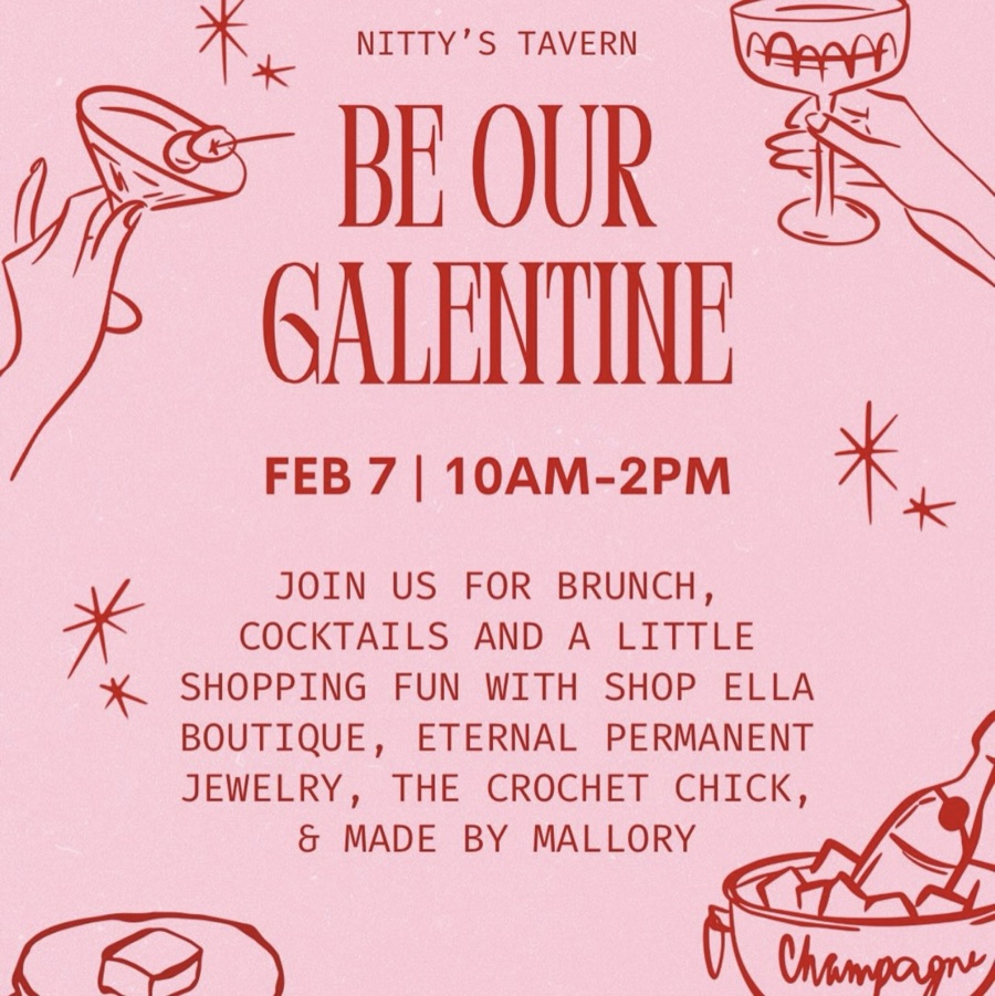 Come celebrate Galentine's at Nitty's Tavern! Join us for brunch, cocktails, and the chance to shop the cutest items from Made By Mallory, Shop Ella Boutique, The Crochet Chick, and Eternal Permanent Jewelry!