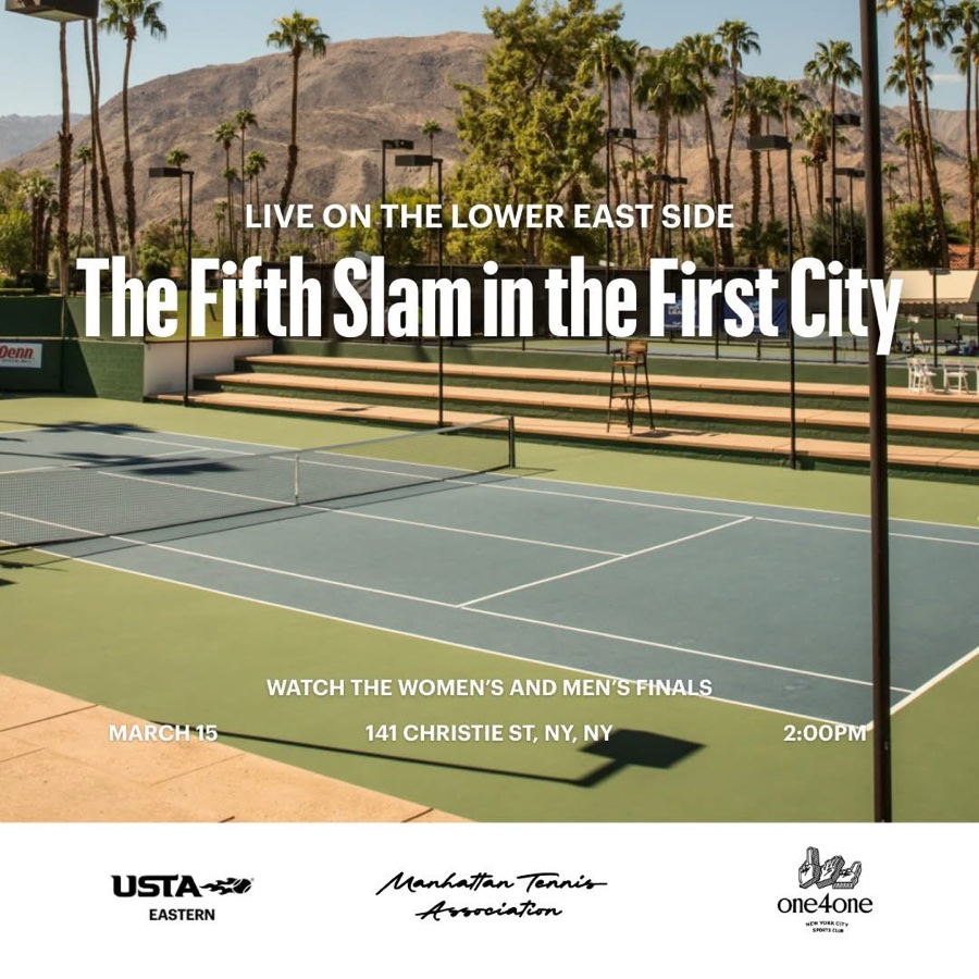 The Fifth Slam LIVE on the Lower East Side. Two finals, one afternoon — Women’s and Men’s back-to-back! 📍 Location One4One Sports Club — Lower East Side, NYC https://www.one4onenyc.com/ One4One is a new two-story sports bar and lounge tucked behind a discreet speakeasy-style entrance. 🎟 Admission — $15 Includes a limited co-branded event tennis tee created especially for this Fifth Slam celebration. 🍸 Food & Beverage Drinks and bites available for purchase. Huge screens, match sound on, in a sports lounge buzzing with tennis players and fans. Open to all. Register: https://luma.com/esq5cxhp