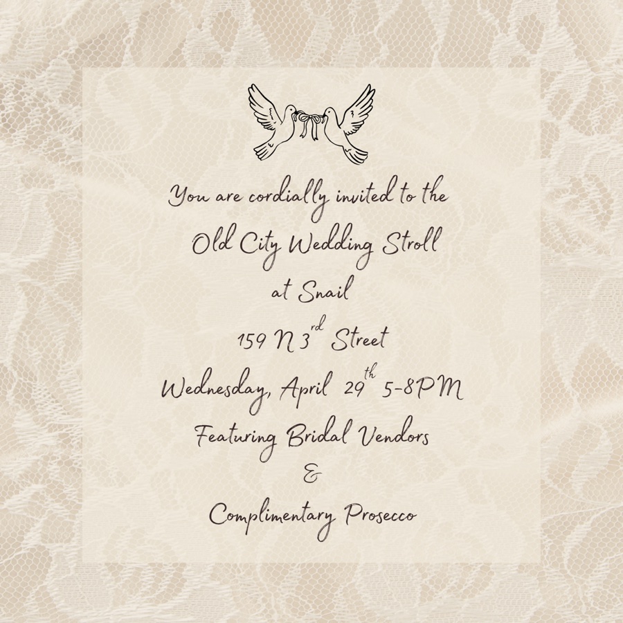 We are thrilled to announce that we will be hosting a pop-up event at the shop during the Old City Wedding Stroll next Wednesday, April 29th! Enjoy a glass of complimentary prosecco as you shop from a selection local vintage and handmade vendors to get you outfitted from engagement to the honeymoon and everything in between. Glass Canary Vintage and Sweet Marie Bridal will have racks of stunning vintage bridal clothing for you to peruse and Room Shop and Feast Jewelry will have a you covered for unique jewelry and accessories to complete the look for your special day. The event is free to attend and when you register ahead with the Old City District and check-in you will receive a free gift bag and be entered to win a grand prize gift basket of goodies from local Old City businesses, including a gift card to Snail! We can’t wait to see you there! 🤍🥂🐌