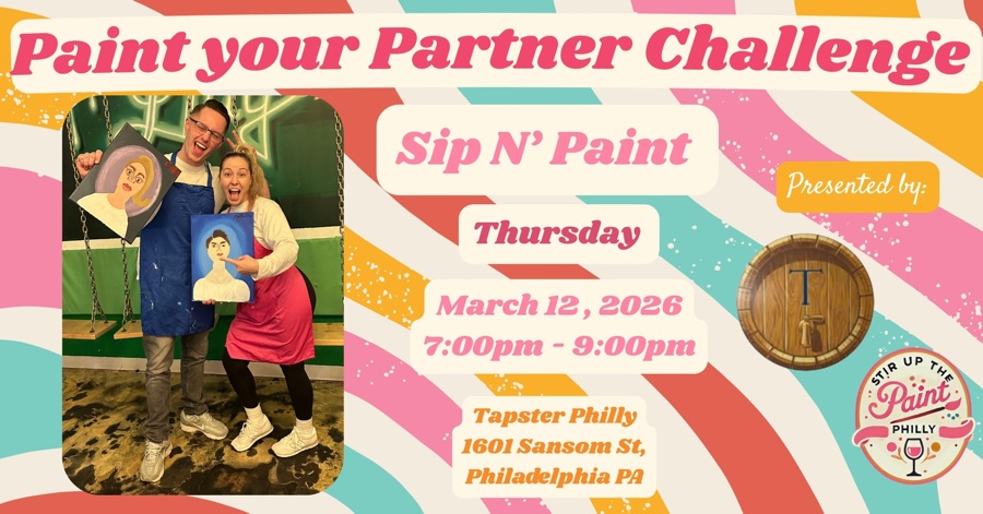 Join us for a fun-filled afternoon of creativity and connection at the “Paint your Partner” Stir Up the Paint Philly Paint & Sip! 🎨✨ In this interactive partner painting experience, guests will be guided step-by-step on how to paint their partner’s facial features, resulting in a one-of-a-kind portrait filled with personality and charm. No painting experience is needed! Whether you’re artists or total beginners, our instructors will break down the process in a fun, approachable way—helping you capture expressions, features, and character while enjoying a relaxed, judgment-free atmosphere. We’ll be painting at Tapster Philly, home of a self-serve tap wall—one of Philly’s newest beverage concepts. Guests can sample a variety of drinks before pouring their favorites at their own pace. Learn more about Tapster here: https://www.tapstertastingroom.com/ Important Details: • This event is 21+ only • Class begins promptly—please arrive early for preferred seating • A 15-minute grace period is allowed; entry after that is at the Master Artist’s discretion • Refunds are only issued for cancellations made at least 24 hours before class time For questions, please contact: stirupthepaintphl@gmail.com