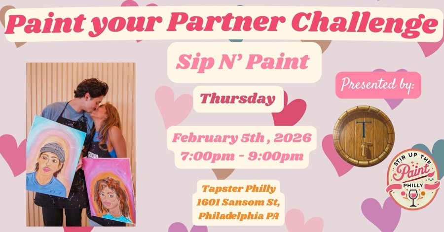 Join us for a fun-filled afternoon of creativity and connection at the “Paint your Paint” Stir Up the Paint Philly Paint & Sip! 🎨✨ In this interactive partner painting experience, guests will be guided step-by-step on how to paint their partner’s facial features, resulting in a one-of-a-kind portrait filled with personality and charm. No painting experience is needed! Whether you’re artists or total beginners, our instructors will break down the process in a fun, approachable way—helping you capture expressions, features, and character while enjoying a relaxed, judgment-free atmosphere. We’ll be painting at Tapster Philly, home of a self-serve tap wall—one of Philly’s newest beverage concepts. Guests can sample a variety of drinks before pouring their favorites at their own pace. Learn more about Tapster here: https://www.tapstertastingroom.com/ Important Details: • This event is 21+ only • Class begins promptly—please arrive early for preferred seating • A 15-minute grace period is allowed; entry after that is at the Master Artist’s discretion • Refunds are only issued for cancellations made at least 24 hours before class time For questions, please contact: stirupthepaintphl@gmail.com