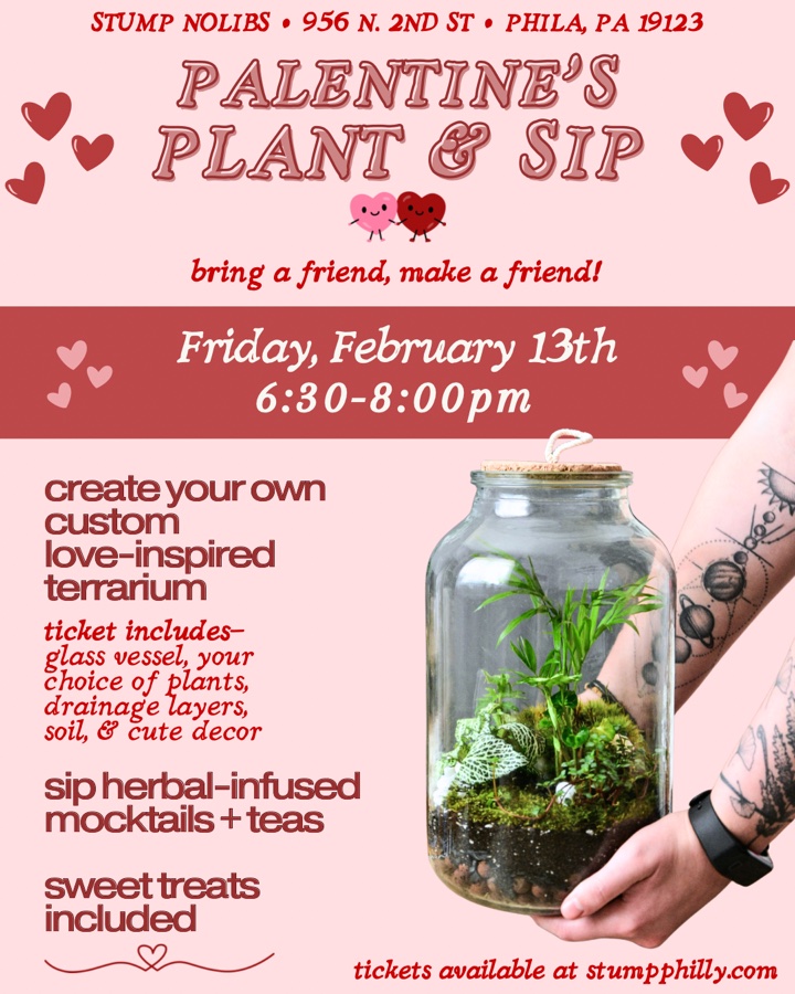 SOLD OUT!! 💞 Looking for a cozy, fun evening centered on friendship, creativity, and great community? Join us on Friday, February 13th from 6:30–8:00pm at STUMP Northern Liberties for a PALentine’s Plant & Sip — a love-and-friendship-inspired night of terrarium building, herbal mocktails, and sweet treats. This welcoming, hands-on workshop is all about connection. Bring a friend, come solo, or meet fellow plant lovers as you create a Valentine’s-inspired terrarium with all materials included. Led by our shopkeeper Caty and open to all experience levels, you’ll be guided step-by-step through plant selection, layering, design, and care in a relaxed, social setting. Your ticket includes a glass terrarium vessel, tropical plants, all terrarium materials and Valentine’s-themed decor, handcrafted herbal mocktails and teas, sweet treats, and all tools and guidance needed. Tickets are $65 per person, space is limited to 12 spots, and BYOB is welcome!