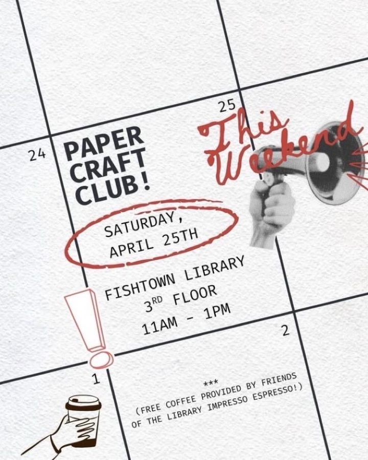 Let’s craft together! Drop in between 11:00am-1:00pm. We’ll make paper crafts we enjoy or learn new ones from each other. This includes card-making, junk journaling, scrapbooking, and anything you can create with paper, scissors, and glue. Coffee provided on 4/25 by Impresso Express! Materials are provided but feel free to bring your own. For adults. Limited to 20 participants. First come, first served. This program takes place on the library's 3rd floor, accessible by stairs or elevator.