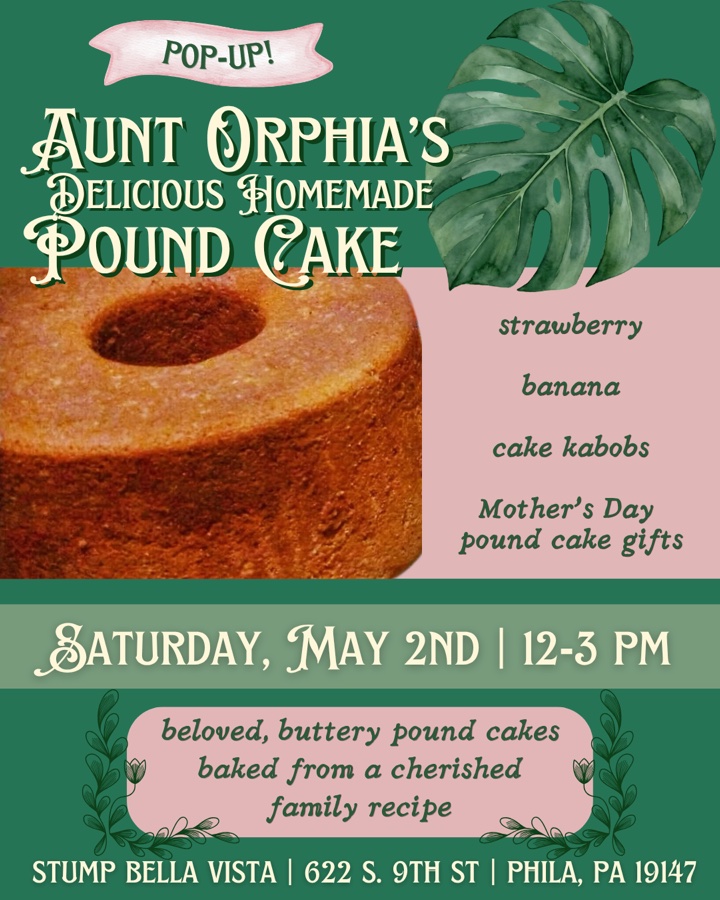 🍰 Looking for a sweet treat? Join us on Saturday, May 2nd from 12–3PM as we welcome back the lovely @auntorphiaspoundcake for a delicious pop-up!💞 Named in honor of the founder’s mother, Orphia Davis-Adams, these beloved, buttery pound cakes are baked from a cherished family recipe passed down through generations. Each cake is rich, moist, and made with care = the perfect taste of home. They’ll be bringing two new flavors: 🍓 Strawberry 🍌 Banana …As well as cake kabobs and other Mother’s Day pound cake gifts ✨ Come grab some treats & see why Aunt Orphia’s has become a household favorite! ❤️