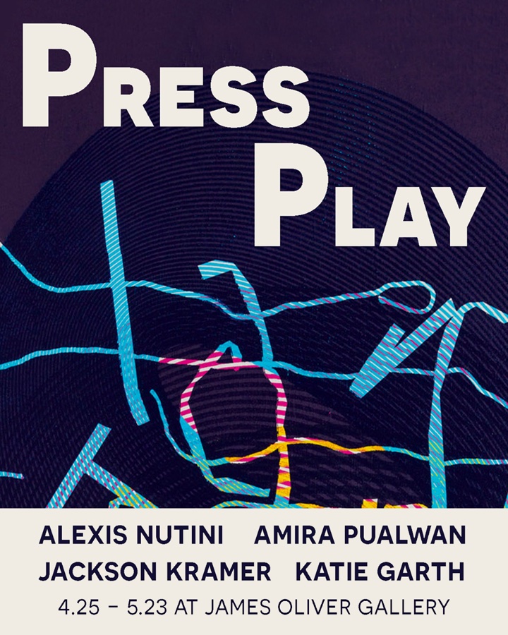 Join us for the opening of our upcoming exhibition, on Saturday, April 25th from 6-9pm. James Oliver Gallery presents Press Play, on view April 25th through May 23rd, 2026. The group exhibition features Alexis Nutini, Amira Pualwan, Jackson Kramer, and Katie Garth. Organized to showcase local artists working primarily in the medium of Printmaking - the selected work includes processes such as relief printing, silk-screen, risograph printing, lithography, etching, and more. The title Press Play alludes to both the traditional and experimental techniques made possible through the use of a printmaking press. This exhibition invites viewers to explore the layered world of prints and beyond—highlighting the medium as both a customary craft and one that is continually evolving. Compositions echo and refine—symbols reappear in new contexts, patterns shift in scale and rhythm, and familiar forms take on compiled meaning.
