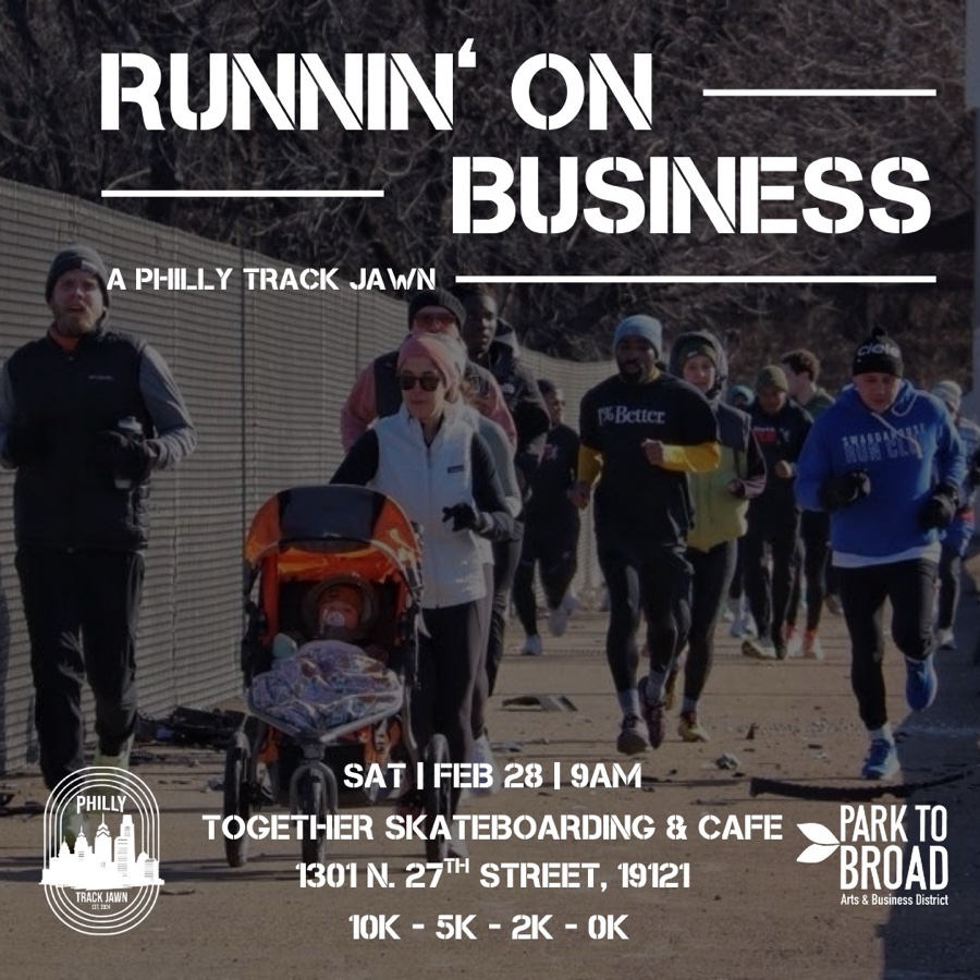 🚀🏁 RUNNIN’ ON BUSINESS 🏁🚀 Join us as we kick off our 2026 series in North Philly with the team from Park To Broad🫡 Sat, Feb 28 @ 9AM — link up at Together Skateboarding & Cafe (1301 N 27th St). ✨8:30 link-up (grab a drink + connect) ✨9:00 announcements + warm-up ✨9:15 Break into groups: 10K / 5K / 2K / 0K (yoga) ✨9:45-11 Post run & walk kickback, raffles, and refreshments provided by Blk Berry Juice Bar