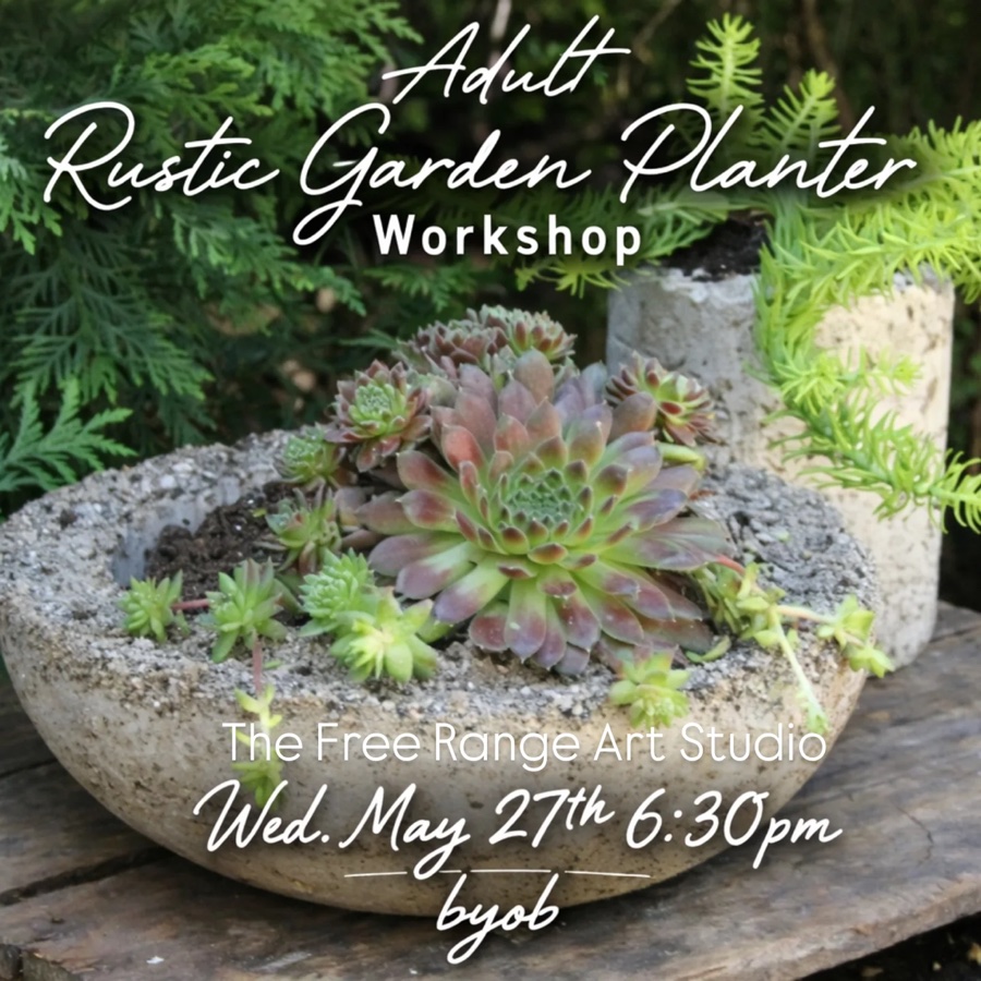 Adult Garden Planter Workshop! Wednesday, May 27th 6:30-8:30 pm In this hands-on class for adults, you’ll craft a garden planter from scratch using a traditional, time-tested recipe. We’ll guide you through the mixing, molding, and shaping process, and all unique supplies will be provided. Each finished piece is designed to age beautifully and be enjoyed for years to come. In this class, you’ll: Learn the art of hypertufa, inspired by traditional English stone troughs. Explore mold techniques: casting a planter inside a mold. Leave with a stunning planter - one to take home, spreading a little greenery for all to enjoy. *(This workshop is for constructing the planter. It does not include any plants!