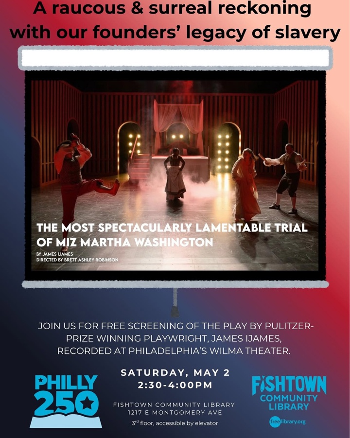 Join us for a free screening of Pulitzer Prize-winner James Ijames' new play, The Most Spectacularly Lamentable Trial of Miz Martha Washington, next Saturday, May 2, at 2:30PM. A satire that explores issues of race, power, and historical memory through a hallucinatory trial of Martha Washington, this play promises to blend striking imagery, amazing production and performances, and a sincere reckoning with the legacy of slavery in the US. This is a recorded performance from its recent run at the Wilma Theater here in Philadelphia. Part of our Philly 250 observance, which reflects on our shared history and futures together. After the screening, feel free to stick around and share your thoughts on the play, performance, and any ideas it inspires for you! This event will be held on our third floor, accessible by elevator.