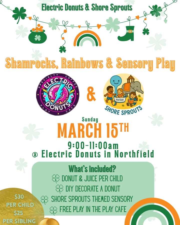 Join Shore Sprouts at Electric Donuts for a St. Patty’s Day collaboration filled with movement, creativity, and sweet treats… perfect for little ones 6 years and under to play, explore, and get their energy out. 🗓 Sunday, March 15 ⏰ 9:00–11:00 AM 📍 Electric Donuts What’s included: ✨ Free play in the café 🍩 Decorate your own donut 🧃 Donut & juice per child 🌈 Shore Sprouts–themed sensory bins A festive morning of play, donuts, and hands-on fun while celebrating St. Patty’s Day—come make memories together! 💚🍀 🔗Sign up now!