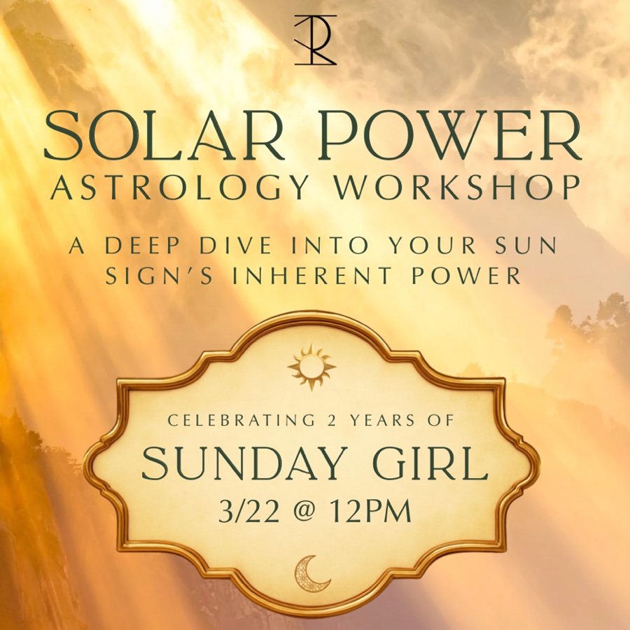 To celebrate Sunday Girl’s solar return, Rebel Daughter Astrology presents SOLAR POWER - a deep dive into your sun sign’s inherent power! Sun sign astrology is where most of us start, b yr astrology doesn’t stop there. Join us as we explore how and where your sun shines, which plant is influencing your sun sign behind the scenes, and how to begin decoding what your solar return (aka your birthday) has to say about your year ahead! Workshop participants will receive a hand-draw birth chart using their birth date and time. You are encouraged to bring a journal or notebook if you would like to joy things down throughout our chat!