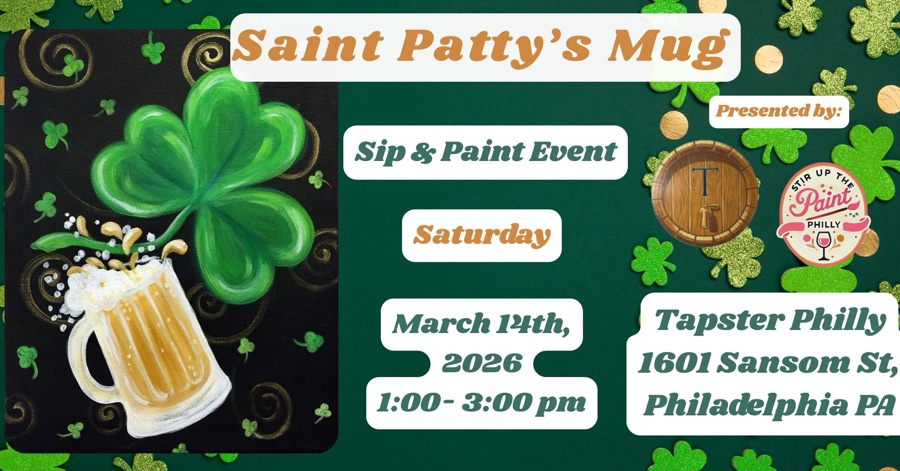 Join us for a fun-filled afternoon of creativity and self-expression at the “St.Pattys Mug” Stir Up the Paint- Paint and Sip Event! Get ready to unleash your inner artist as we guide you through the process of creating a stunning masterpiece, all while enjoying your favorite beverages. Whether you’re a seasoned painter or a total beginner, this event is open to everyone. Our talented instructors will provide step-by-step instructions, ensuring that you leave with a work of art you can be proud of. Our hosts at Tapster offer a Self-Serve Tapster bar, a newer concept in the Philly area where you can sample a variety of beverages, and then self-pour your favorites after sampling. You can find out more about Tapster at: https://www.tapstertastingroom.com/ NOTE: This event is 21+ CLASS BEGINS ON TIME, PLEASE ARRIVE EARLY FOR PREFERRED SEATING THERE IS A 15 MINUTE GRACE PERIOD, AFTER THE GRACE PERIOD ENDS IT IS UP TO THE MASTER ARTISTS’ DISCRETION TO ALLOW YOU TO JOIN REFUNDS ARE ONLY ISSUED TO CANCELATIONS MADE WITHIN 24 HOURS OF CLASS TIME. Reach out to Stirupthepaintphl@gmail.com for further questions