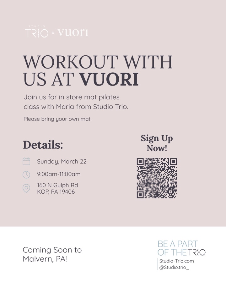 Before the doors officially open… we’re bringing Trio to you. Studio Trio x Vuori King of Prussia Mat Pilates Pop-Up March 22 9 am - 11 am Strong foundations. Intentional movement. Community energy. This is just the beginning. Spots are limited.