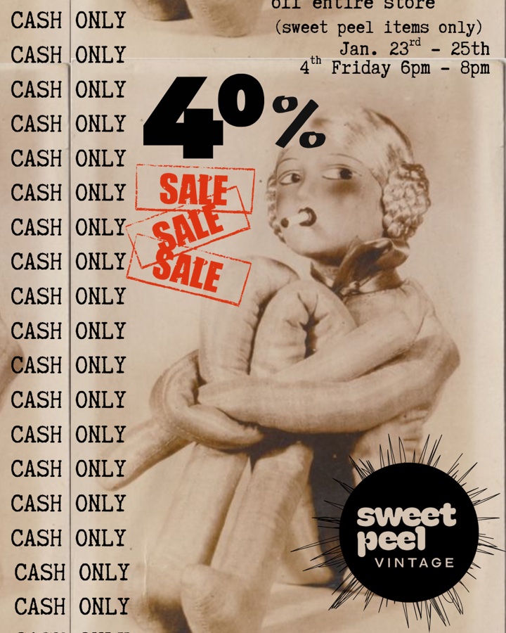 We’re starting off the year with a bang! Starting on the eve of 4th Friday, January 23rd and lasting throughout the entire weekend we’re offering 40% off the entire shop! That doesn’t include our vendors. But the only thing is it’s CASH ONLY. Keep the government out of our pockets and we’ll continue to bring you a new and improved items each week!