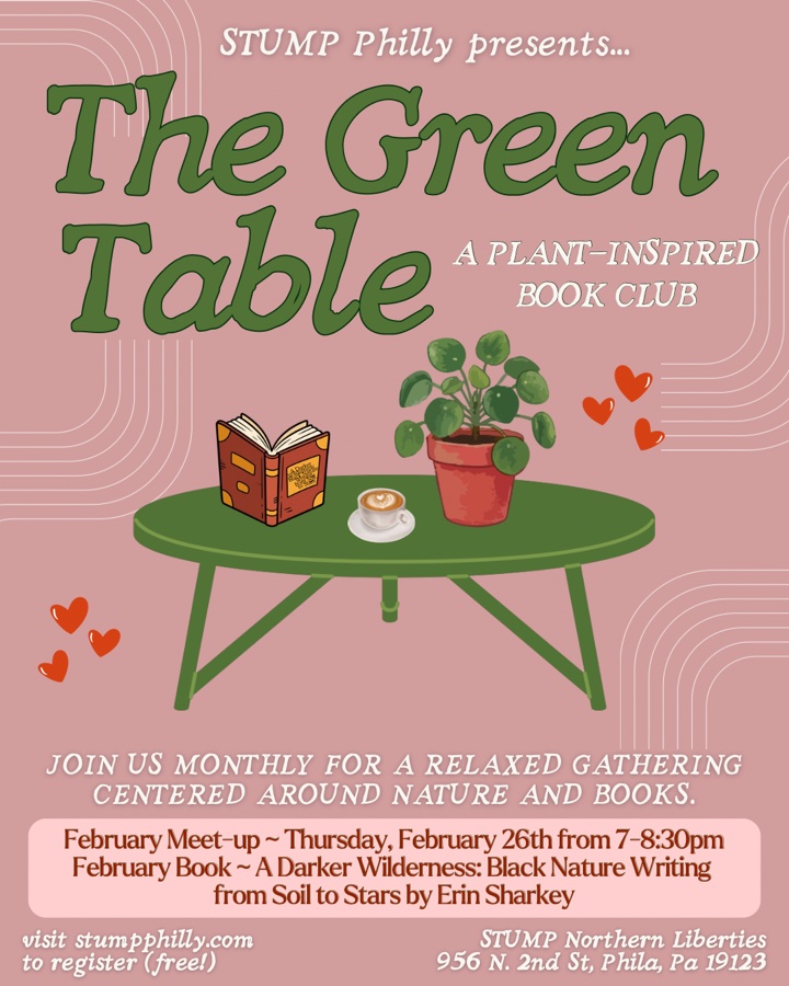Join us for our monthly Green Table Book Club gathering at STUMP Northern Liberties as we celebrate Black History Month with our February pick, A Darker Wilderness: Black Nature Writing From Soil to Stars, edited by Erin Sharkey. This thoughtful anthology features essays, poetry, and reflections from Black writers exploring relationships with land, nature, environmental justice, and cultural connection to the natural world. Together, we’ll enjoy relaxed conversation, tea, and light snacks in a welcoming plant-filled space — no pressure to finish the book, just come ready to connect and share! Visit our website stumpphilly.com or IG: @stump_nolibs to register (free!)