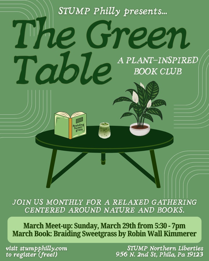 Join us for our monthly Green Table Book Club gathering at STUMP Northern Liberties as we discuss our March book pick, Braiding Sweetgrass: Indigenous Wisdom, Scientific Knowledge, and the Teachings of Plants by Robin Wall Kimmerer. This bestselling book that weaves together scientific botany with Indigenous wisdom to explore humanity's relationship with the natural world, arguing for a reciprocal, gift-based relationship with the earth. As a botanist and a member of the Citizen Potawatomi Nation, Kimmerer uses her unique perspective to show how plants and animals offer lessons and gifts, encouraging readers to listen to the "languages of other beings" to foster a deeper ecological consciousness. The book is structured as a braid of stories, blending personal narrative, scientific inquiry, and Potawatomi traditions. Together, we’ll enjoy relaxed conversation, tea, and light snacks in a welcoming plant-filled space — no pressure to finish the book, just come ready to connect and share! Visit our website stumpphilly.com or IG: @stump_nolibs to register (free!)