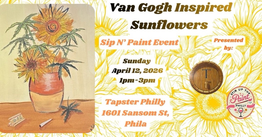 Join us for a fun-filled afternoon of creativity and self-expression at the “Van Gogh Inspired Sunflowers” Stir Up the Paint- Paint and Sip Event! Get ready to unleash your inner artist as we guide you through the process of creating a stunning masterpiece, all while enjoying your favorite beverages. Whether you’re a seasoned painter or a total beginner, this event is open to everyone. Our talented instructors will provide step-by-step instructions, ensuring that you leave with a work of art you can be proud of. Our hosts at Tapster offer a Self-Serve Tapster bar, a newer concept in the Philly area where you can sample a variety of beverages, and then self-pour your favorites after sampling. You can find out more about Tapster at: https://www.tapstertastingroom.com/ NOTE: This event is 21+ CLASS BEGINS ON TIME, PLEASE ARRIVE EARLY FOR PREFERRED SEATING THERE IS A 15 MINUTE GRACE PERIOD, AFTER THE GRACE PERIOD ENDS IT IS UP TO THE MASTER ARTISTS’ DISCRETION TO ALLOW YOU TO JOIN REFUNDS ARE ONLY ISSUED TO CANCELATIONS MADE WITHIN 24 HOURS OF CLASS TIME. Reach out to Stirupthepaintphl@gmail.com for further questions