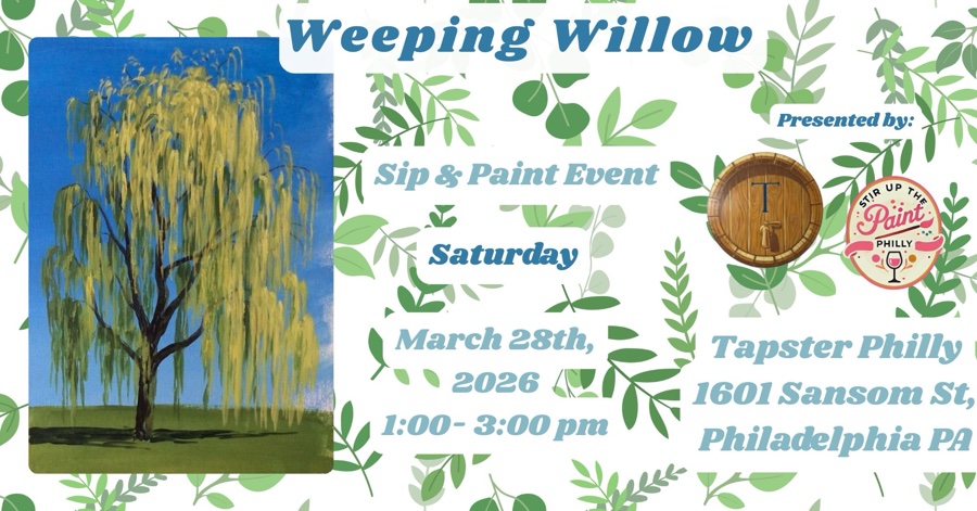 Join us for a fun-filled afternoon of creativity and self-expression at the “Weeping Willow” Stir Up the Paint- Paint and Sip Event! Get ready to unleash your inner artist as we guide you through the process of creating a stunning masterpiece, all while enjoying your favorite beverages. Whether you’re a seasoned painter or a total beginner, this event is open to everyone. Our talented instructors will provide step-by-step instructions, ensuring that you leave with a work of art you can be proud of. Our hosts at Tapster offer a Self-Serve Tapster bar, a newer concept in the Philly area where you can sample a variety of beverages, and then self-pour your favorites after sampling. You can find out more about Tapster at: https://www.tapstertastingroom.com/ NOTE: This event is 21+ CLASS BEGINS ON TIME, PLEASE ARRIVE EARLY FOR PREFERRED SEATING THERE IS A 15 MINUTE GRACE PERIOD, AFTER THE GRACE PERIOD ENDS IT IS UP TO THE MASTER ARTISTS’ DISCRETION TO ALLOW YOU TO JOIN REFUNDS ARE ONLY ISSUED TO CANCELATIONS MADE WITHIN 24 HOURS OF CLASS TIME. Reach out to Stirupthepaintphl@gmail.com for further questions