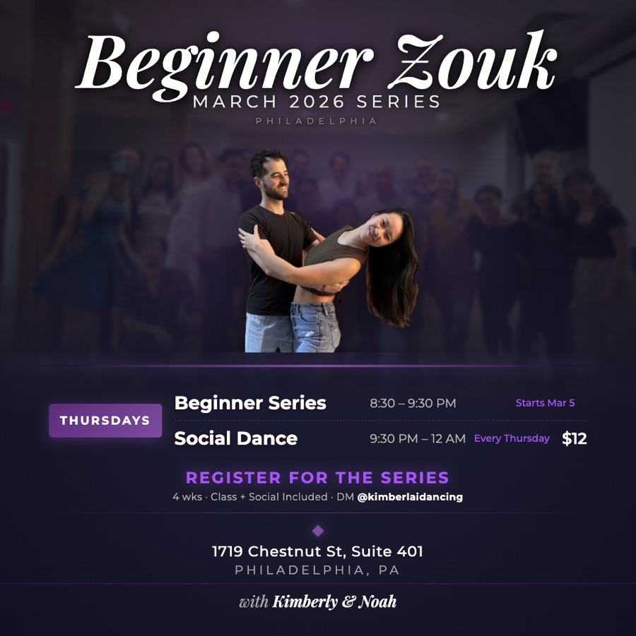 Learn to dance. Meet new people. Have a great time. No experience needed! Brazilian zouk is a smooth, connected partner dance with flowing movement and fun music. We’re kicking off our next 4-week beginner series this March, and it’s the perfect excuse to try something new. You’ll rotate partners throughout class (no need to bring a friend, though it’s more fun if you do), so you’ll naturally meet a bunch of people along the way. After class, we keep the music going until midnight for a social dance - included with your registration. Each week builds on the last, so you’ll deepen your skills and confidence as you go, rather than starting fresh every class. “I was hesitant to join but the community welcomed me in entirely. I would recommend this class to any beginner who wants to give zouk a try.” ⭐️⭐️⭐️⭐️⭐️ “Warm, welcoming and most of all, fun. I truly felt I had joined a loving community.” ⭐️⭐️⭐️⭐️⭐️ “I was able to fully integrate my new skills into my dancing immediately.” ⭐️⭐️⭐️⭐️⭐️ “You taught us dance in the most unconventional way, using everyday language and examples from all kinds of fields, and somehow it all clicked.” ⭐️⭐️⭐️⭐️⭐️ 🗓️ 4 Thursdays in March- Mar 5, 12, 19, & 26 ⏰ 8:30 - 9:30 PM class + social dancing until midnight 📍1719 Chestnut St, Suite 401 (Center City) 💰$100 for the full 4-week series DM @kimberlaidancing on Instagram for any questions.